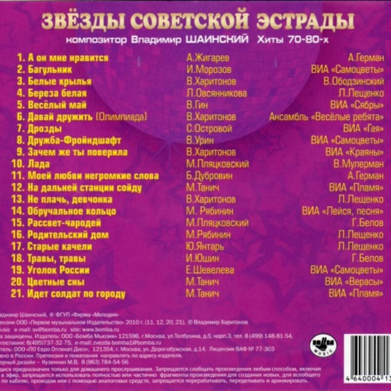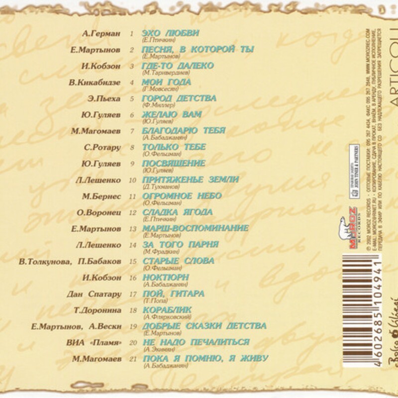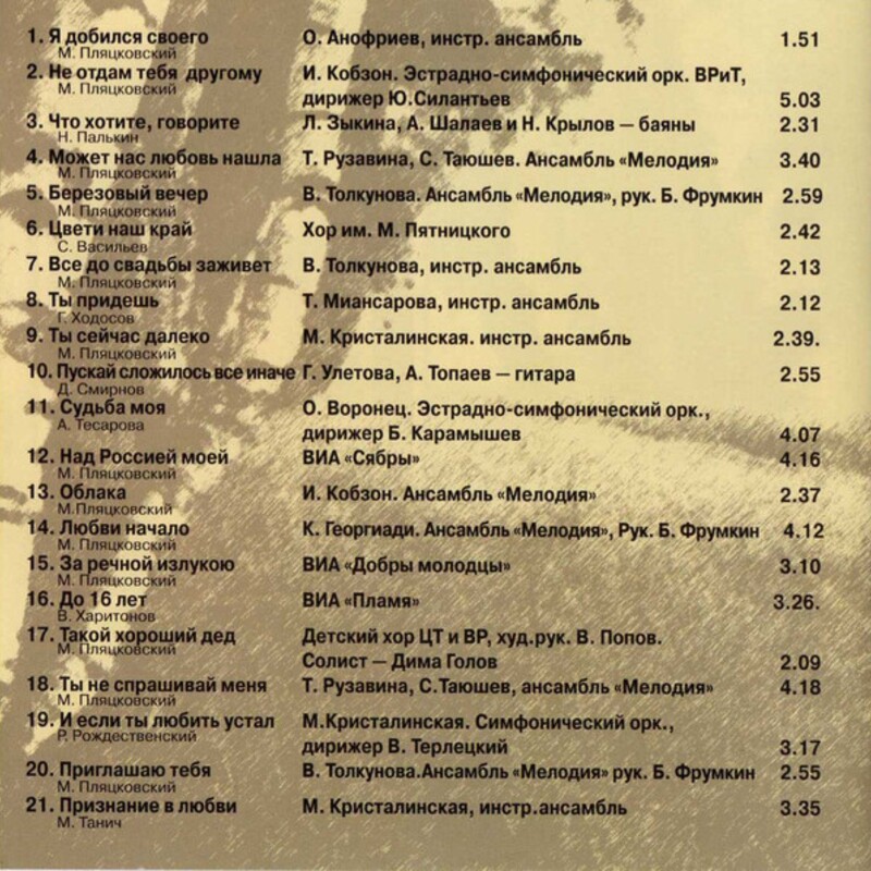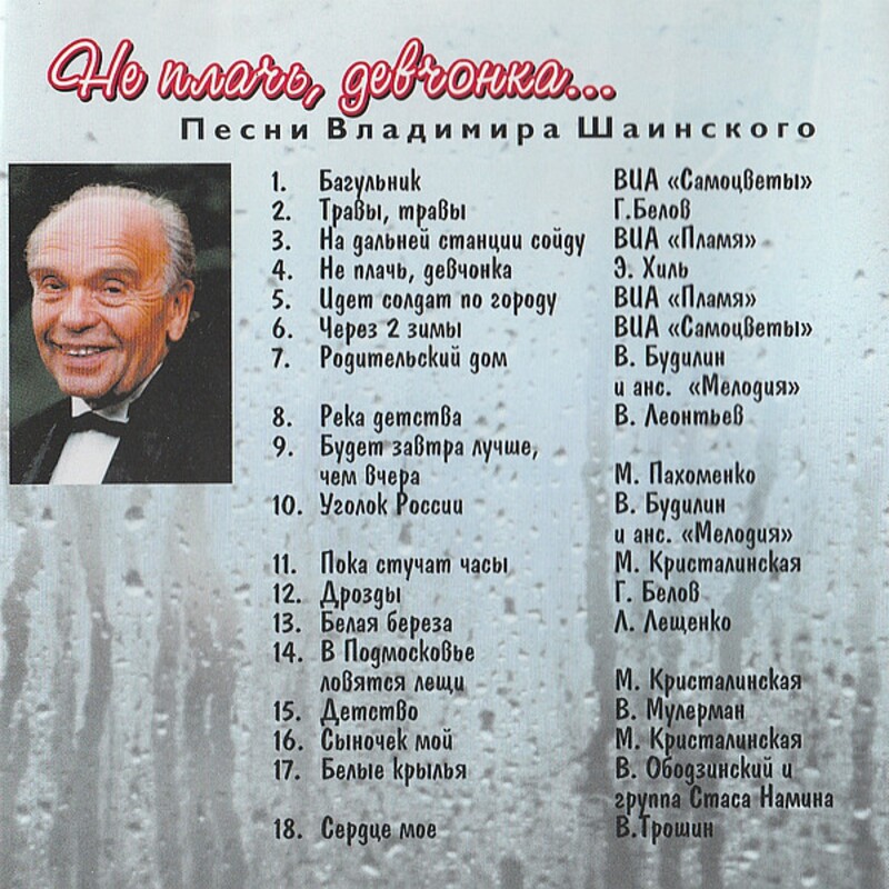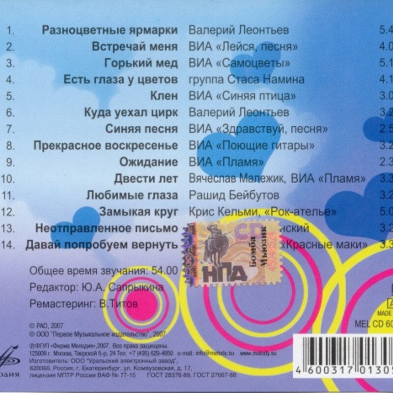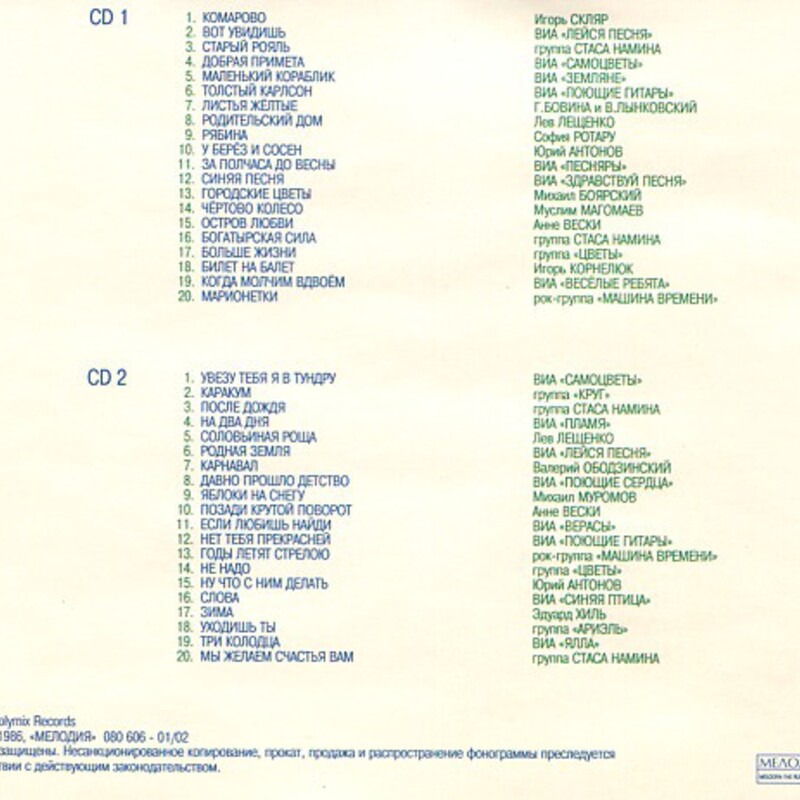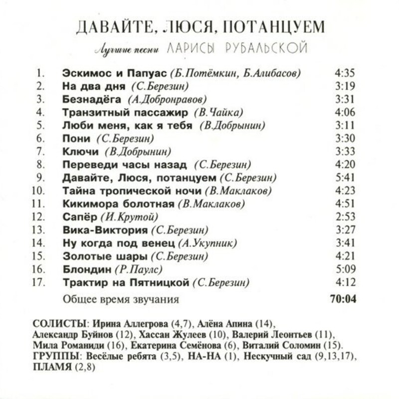 Примечание: на диске исполнителем песни указаны ВИА "Пламя" и ВИА "Акварели". На самом деле песня исполнена участниками ВИА "Пламя" Ю. Редько и И. Шачневой.